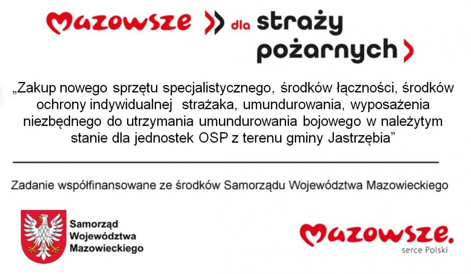 „Zakup nowego sprzętu specjalistycznego, środków łączności, środków ochrony indywidualnej strażaka, umundurowania, wyposażenia niezbędnego do utrzymania umundurowania bojowego w należytym stanie dla jednostek OSP z terenu gminy Jastrzębia” Zadanie „Współfinansowano ze środków Samorządu Województwa Mazowieckiego w ramach zadania OSP-edycja 2025”